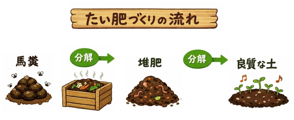 「微生物が糞を発酵することで堆肥ができる。