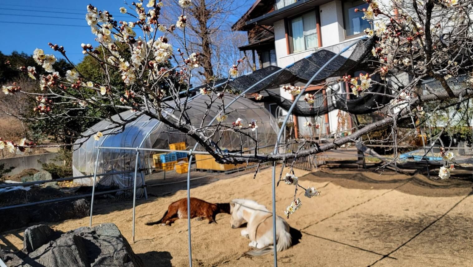 我が家の梅の木はしろくろの放牧場にありますが、今年も花が咲きました。